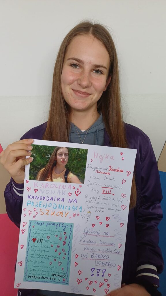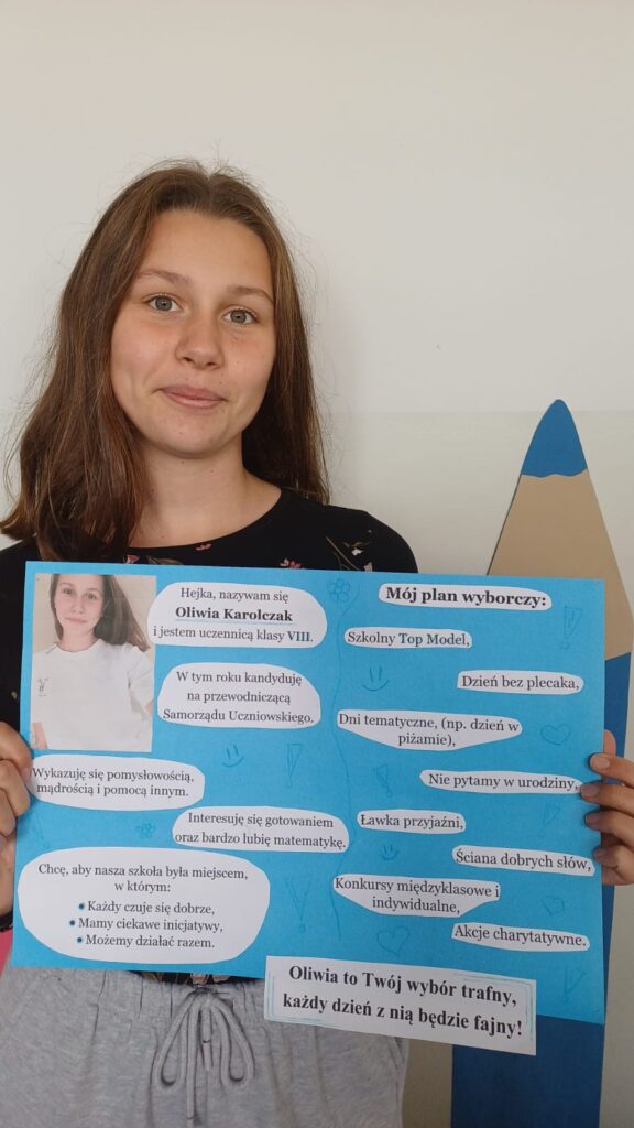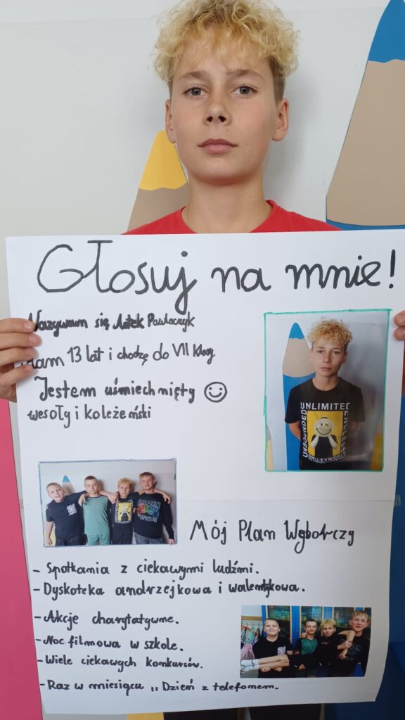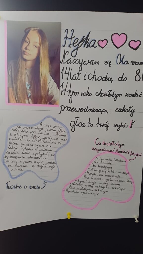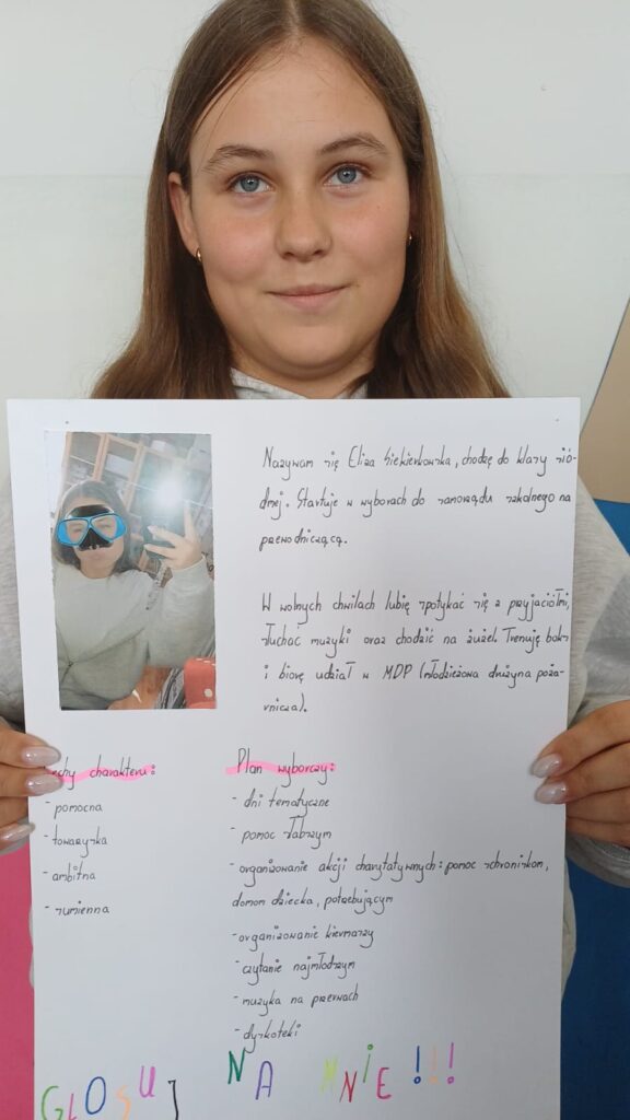 W najbliższych dniach zostaną przeprowadzone wybory do Samorządu Uczniowskiego na rok szkolny 2023/2024. Na korytarzu szkolnym zostały wywieszone plakaty osób, które kandydują. Uczniowie mogą dowiedzieć się z nich, jakie propozycje przygotowali kandydaci i jakie mają pomysły, aby urozmaicić życie szkolne.