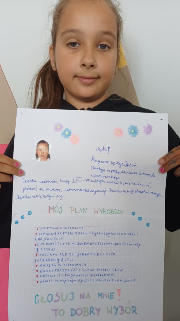 W głosowaniu na wybranego kandydata wezmą udział wszyscy uczniowie z naszej szkoły. Wcześniej dzieci zapoznają się z plakatami wyborczymi naszych kandydatów a 23 listopada dokonają głosowania na kartach wyborczych na jednego z nich.